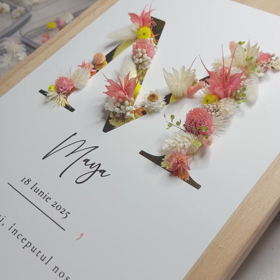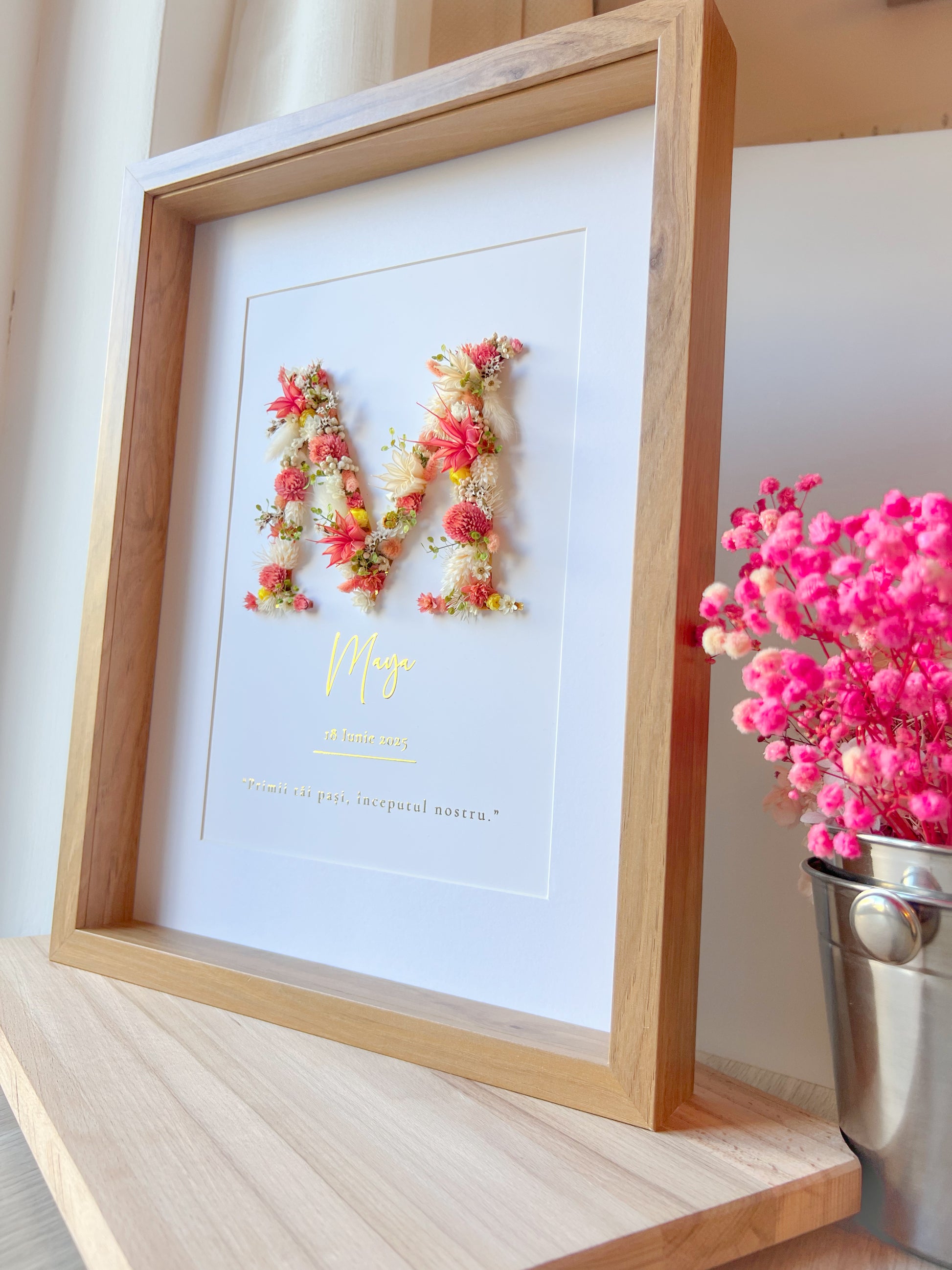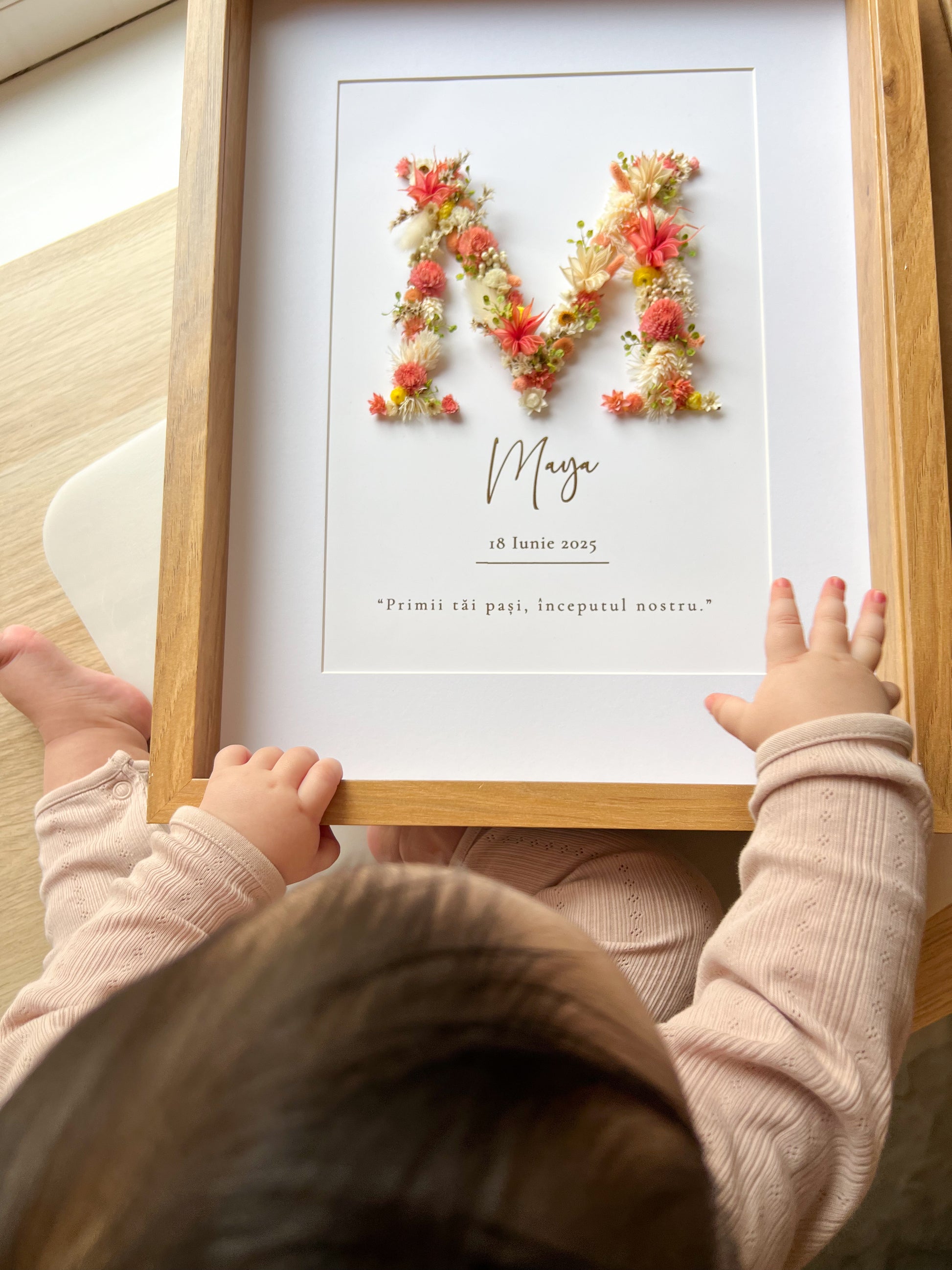 Fiecare inițială florală este o grădină în miniatură, creată manual cu peste 41 de varietăți de flori și frunziș conservate. Fiecare floare este așezată cu grijă, astfel încât litera ta nu doar prinde contur - ci înflorește într-o poveste. Fie că este vorba de prima inițială a unui nou-născut, o amintire din timpul maternității sau un omagiu adus cuiva drag, rama ta devine o amintire vie surprinsă în timp.