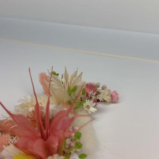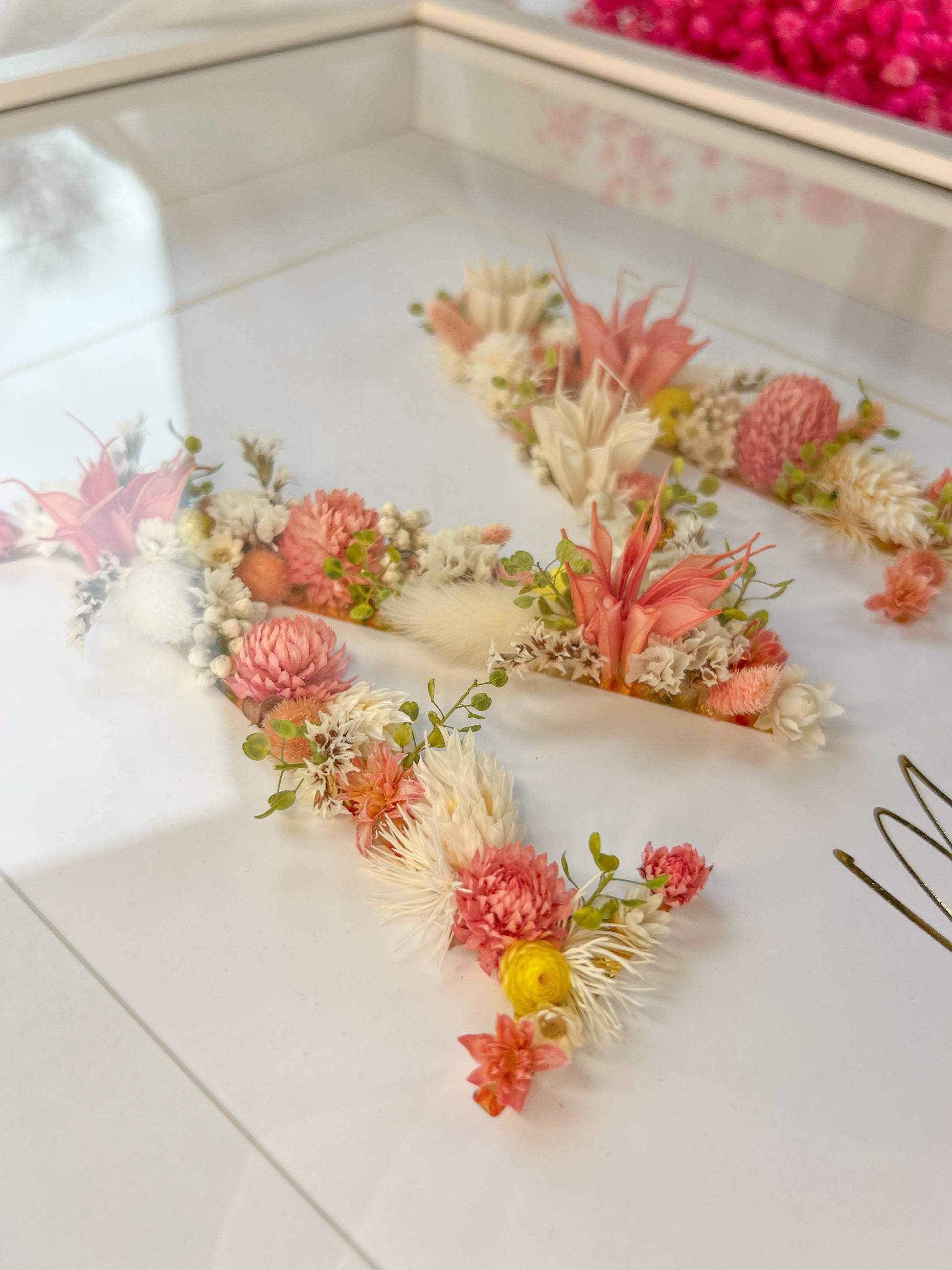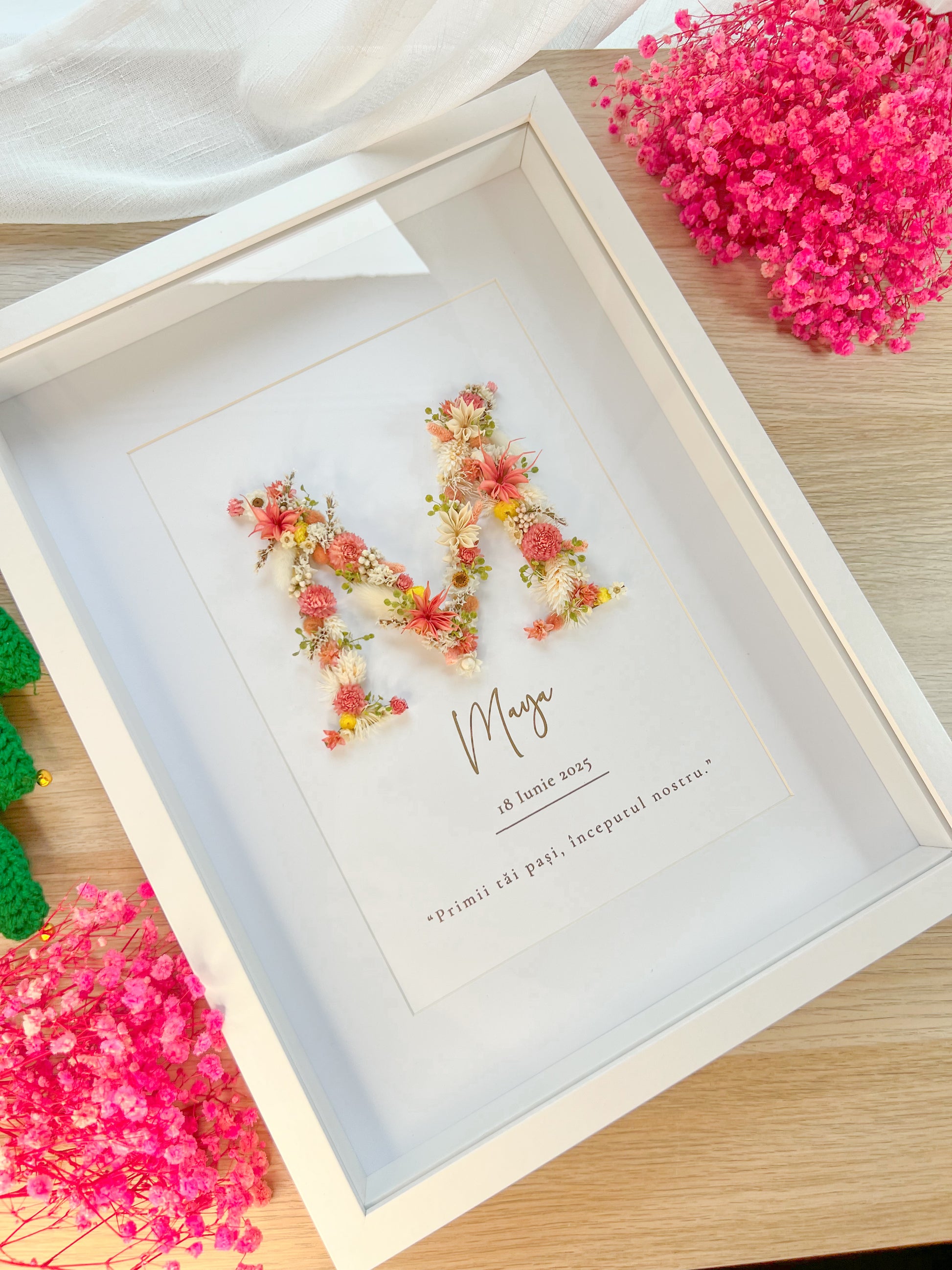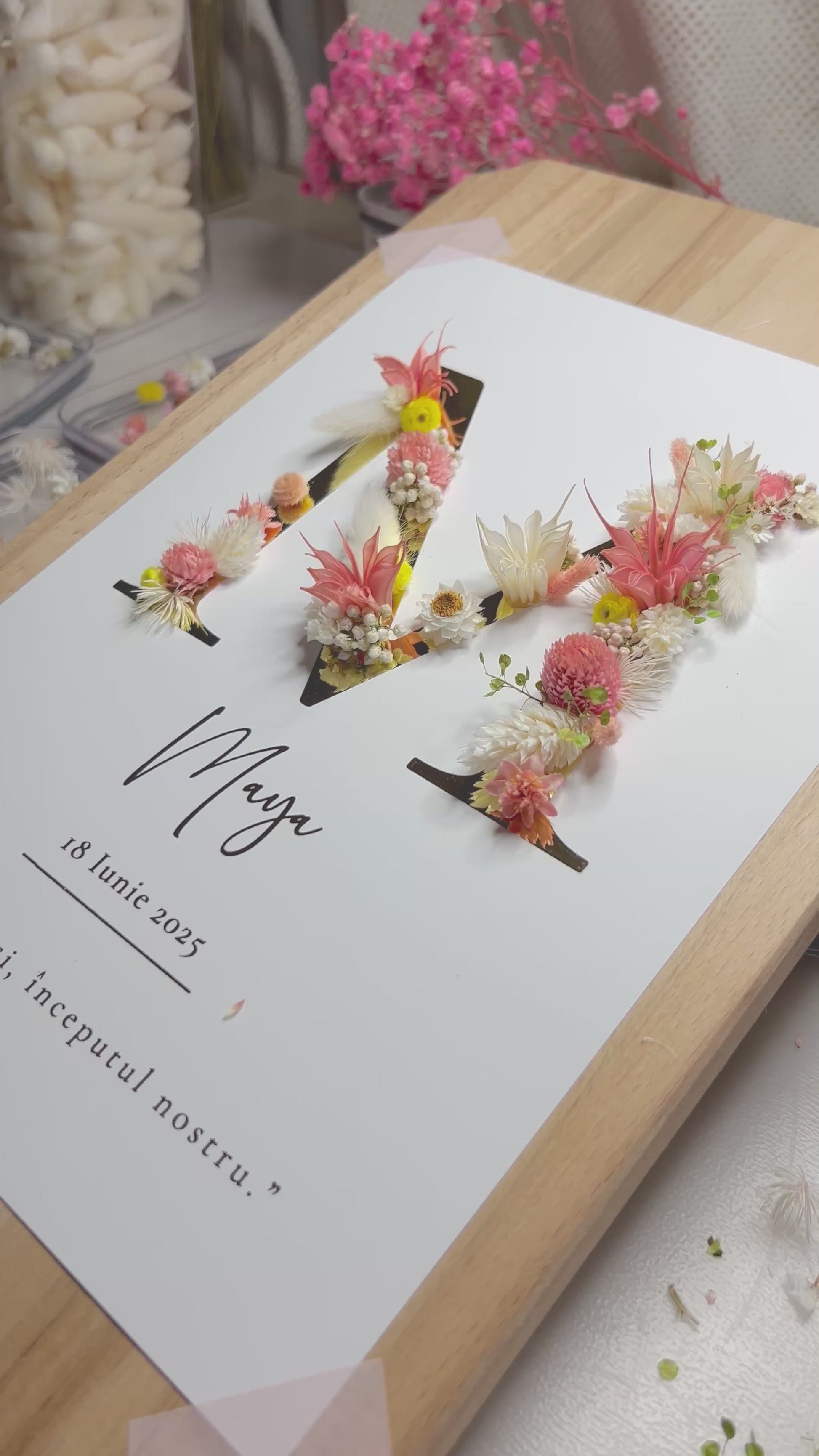 Fiecare inițială florală este o grădină în miniatură, creată manual cu peste 41 de varietăți de flori și frunziș conservate. Fiecare floare este așezată cu grijă, astfel încât litera ta nu doar prinde contur - ci înflorește într-o poveste. Fie că este vorba de prima inițială a unui nou-născut, o amintire din timpul maternității sau un omagiu adus cuiva drag, rama ta devine o amintire vie surprinsă în timp.