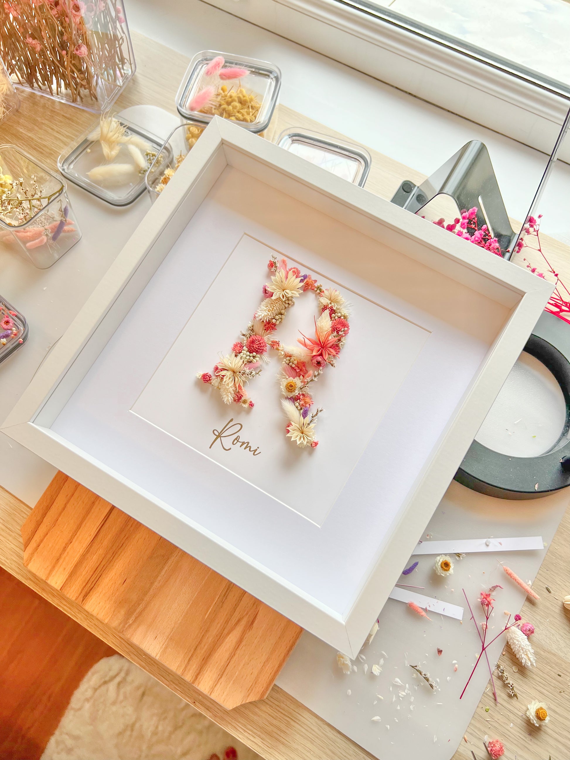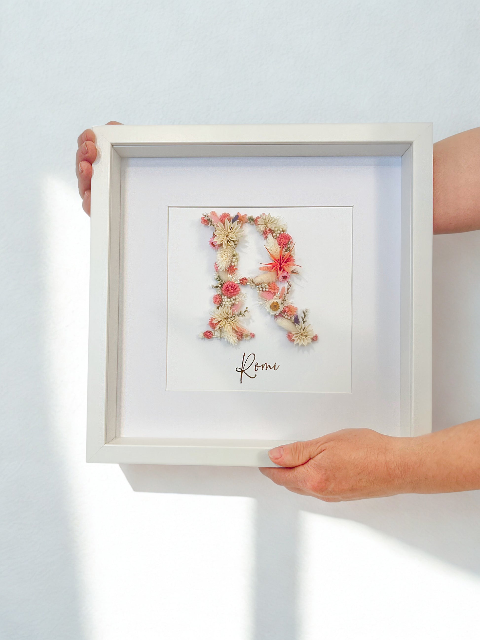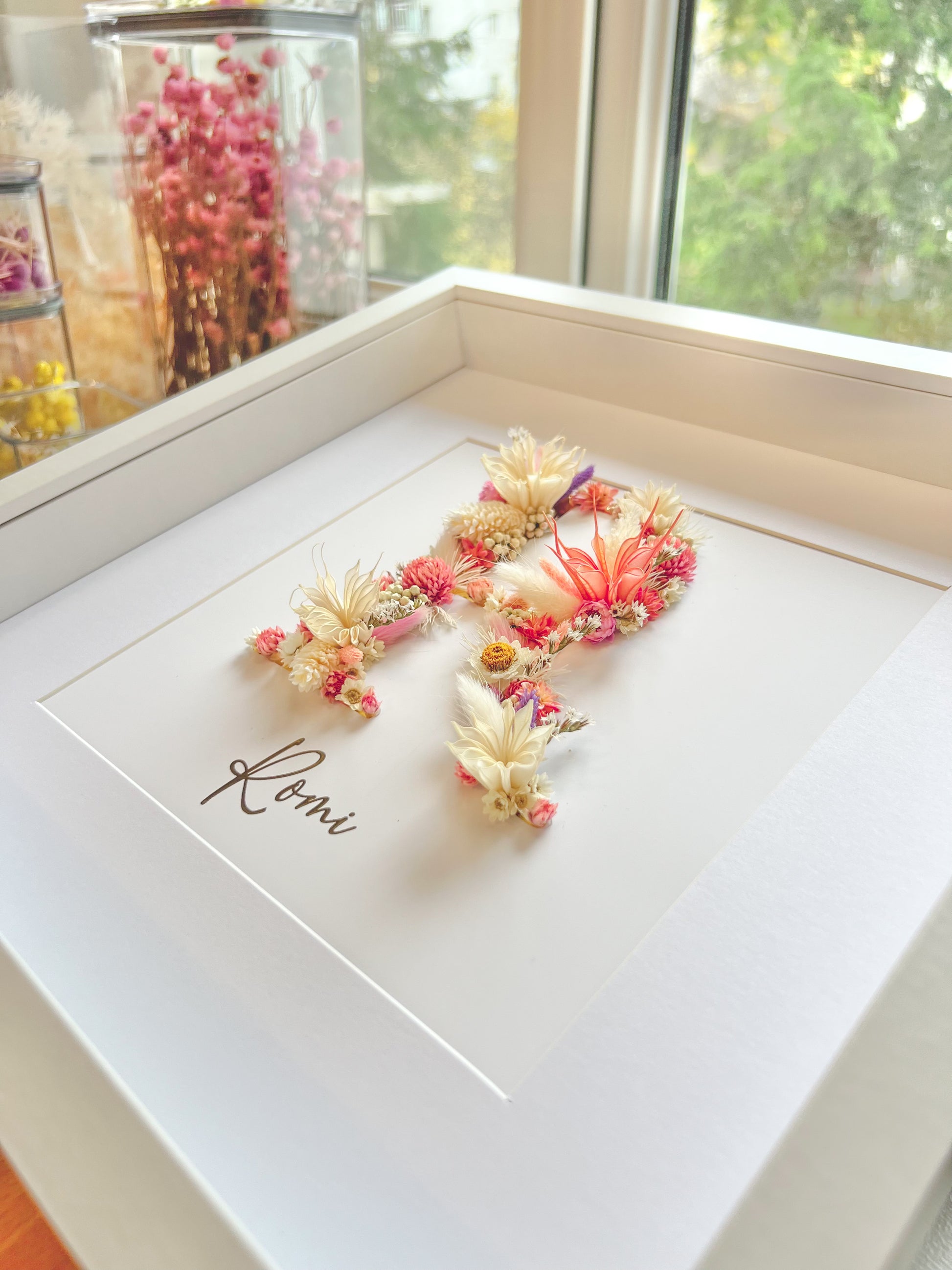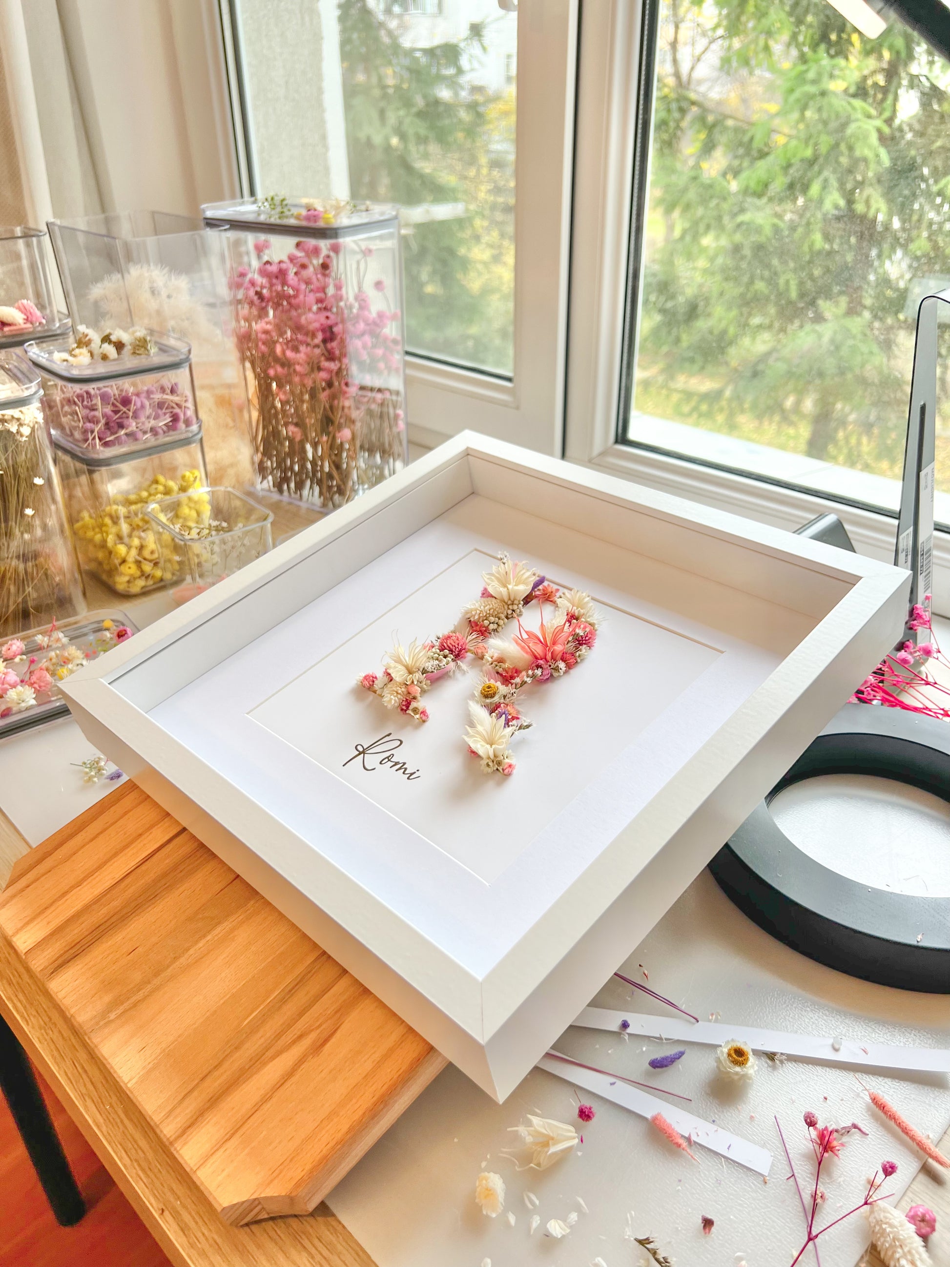Fiecare inițială florală este o grădină în miniatură, creată manual cu peste 41 de varietăți de flori și frunziș conservate. Fiecare floare este așezată cu grijă, astfel încât litera ta nu doar prinde contur - ci înflorește într-o poveste. Fie că este vorba de prima inițială a unui nou-născut, o amintire din timpul maternității sau un omagiu adus cuiva drag, rama ta devine o amintire vie surprinsă în timp.